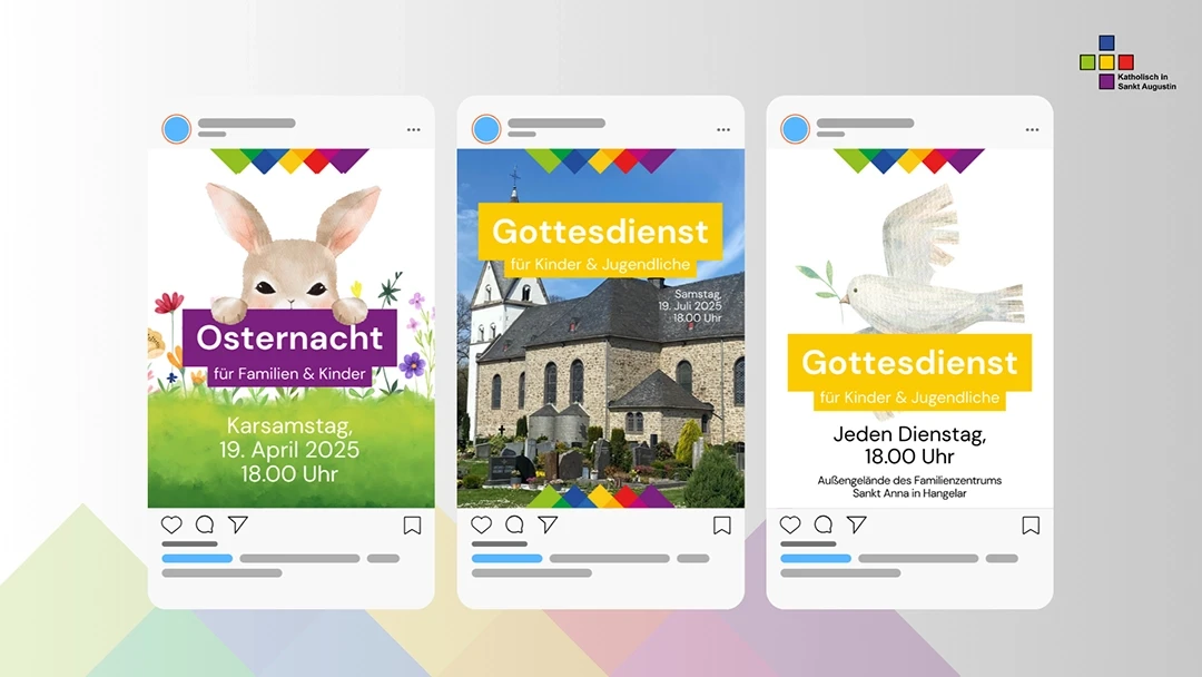 Um die Kirchengemeinschaft im digitalen Raum sichtbar zu machen, haben wir flexible Templates für Plattformen wie Instagram und Facebook erstellt. Diese Vorlagen ermöglichen es dem Kunden, Bilder und Texte schnell auszutauschen, während das Branding durch die markanten Farb-Overlays und die konsistente Typografie immer gewahrt bleibt. So entsteht ein professioneller Feed, der auch zwischen Lifestyle-Content hervorsticht und postübergreifend die Gestaltungselemente wieder zusammenfügt.