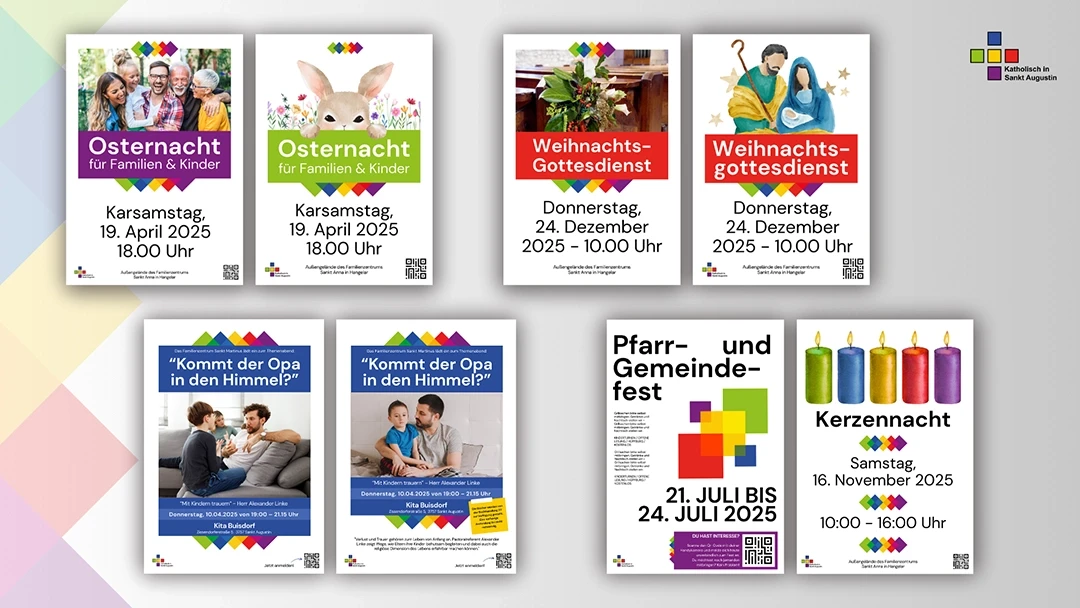 Die Plakatreihen für Anlässe wie Ostern, Weihnachten oder Gemeindefeste nutzen eine starke, emotionale Bildsprache kombiniert mit plakativer Typografie. Besonders bei sensiblen Themen (z.B. „Kommt der Opa in den Himmel?“) dient das Design als ruhiger, aber moderner Rahmen, der Aufmerksamkeit erzeugt, ohne marktschreierisch zu wirken.Durch die Integration von QR-Codes und einer reduzierten Icon-Sprache schlagen wir die Brücke zwischen analogem Aushang und digitaler Anmeldung. Das Layout bleibt dabei so flexibel, dass sowohl festliche Anlässe wie die „Kerzennacht“ als auch pädagogische Themenabende in einem konsistenten, hochwertigen Look präsentiert werden können.