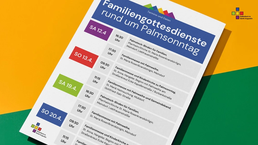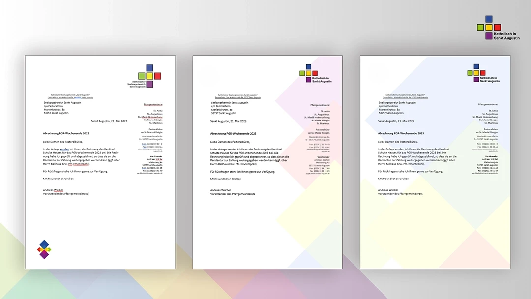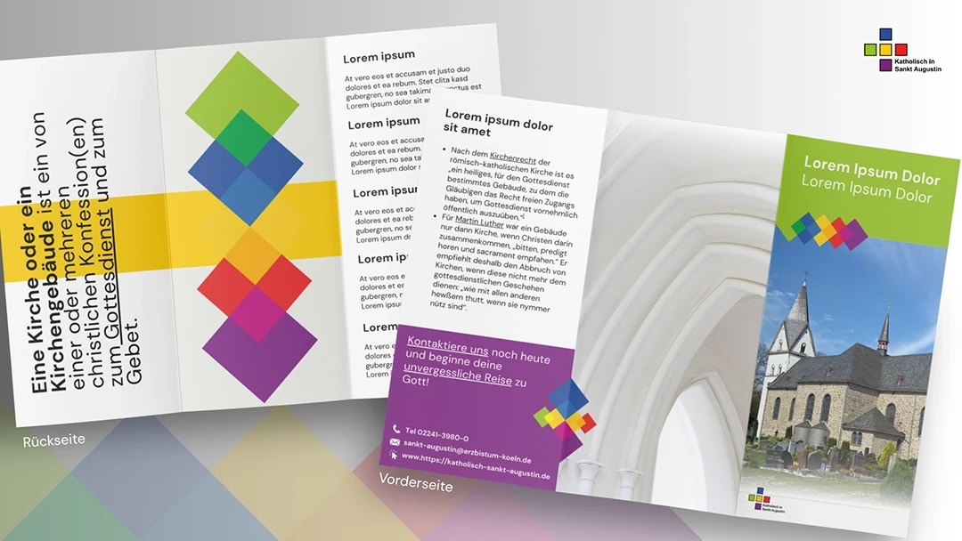 Ergebnis: Ein mutiges, farbenfrohes Erscheinungsbild, das das Image der Kirche in Sankt Augustin radikal verjüngt hat. Das neue Design sorgt für eine hohe Wiedererkennbarkeit im Stadtbild und schafft eine klare Identifikation über alle Kommunikationskanäle hinweg.